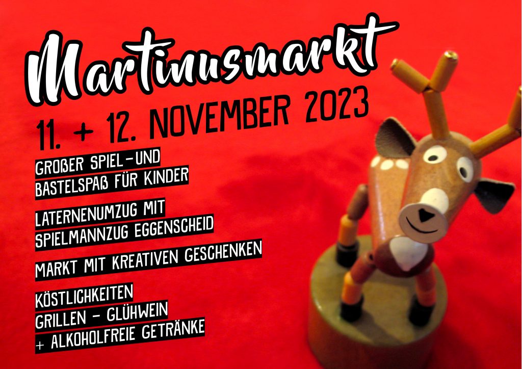 Am 11. und 12. November 2023 bietet der Martinusmarkt kulinarische Köstlichkeiten, schön dekorierte Verkaufsstände mit interessanten Geschenkideen für die Advents- und Weihnachtszeit. Laternenbasteln und ein Laternenumzug mit dem Spielmannzug Eggenscheid gehören ebenso dazu, wie Dosenwerfen, Malen und Basteln für die Kinder.