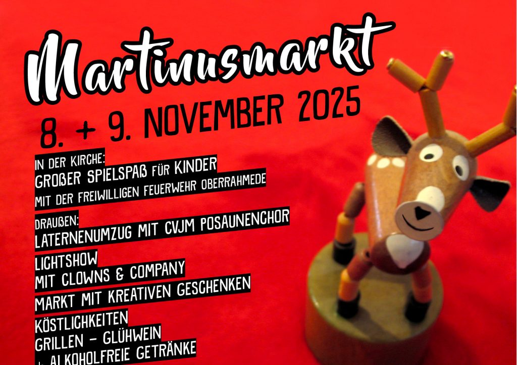 Am 8. und 9. November bietet der Martinusmarkt kulinarische Köstlichkeiten, schön dekorierte Verkaufsstände mit interessanten Geschenkideen für die Advents- und Weihnachtszeit. Die Feuerwehr Oberrahmede gestaltet das Spiel- und Bastelprogramm für die Kinder. Der Posaunenchor CVJM Lüdenscheid sorgt für den musikalischen Rahmen bei dem Laternenumzug. Anschließend präsentiert „Clowns & Company“ eine spannednde Lichtshow.