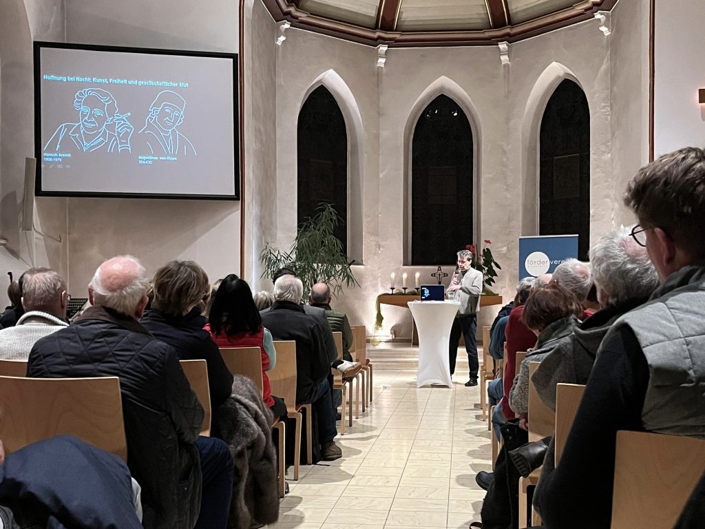Es ist dunkel in der Evangelischen Kirche Oberrahmede an diesem Freitagabend. Nicht nur draußen. Dr. Thomas Schielke beginnt seinen Vortrag mit der Feststellung, dass die Nacht nicht nur eine Tageszeit sei, sondern ein Zustand. Eine Metapher für eine Zeit, in der Nachrichten schwerer wiegen als Hoffnungen, in der Freiheit verletzlich erscheint und die Frage drängt, was bleibt, wenn Gewissheiten schwinden. Schielke spricht nicht über grelles Licht, das blendet. Er spricht über jenes Licht, das bleibt. Über Hoffnung.
