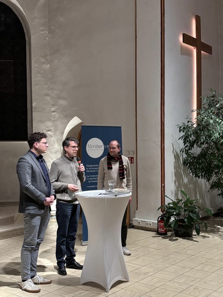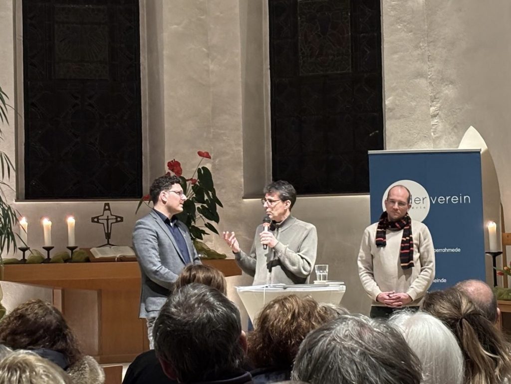 Im zweiten Teil des Abends tritt Schielke ins Gespräch mit Dominik Hass-Sommer, Vorsitzender des Kulturausschusses in Lüdenscheid, und Pfarrer Michael Siol. Nach der globalen Perspektive wird es lokal. Doch das Gespräch wirkt nicht wie ein Bruch, sondern wie eine Fortsetzung auf anderer Ebene.