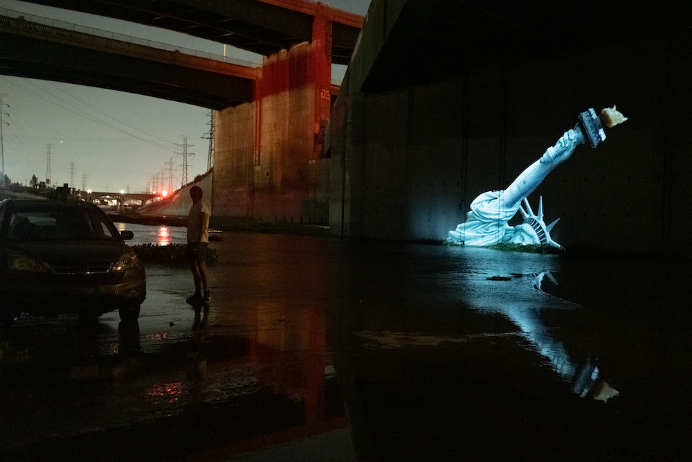 Projektion der Freiheitsstatue von Vjaybombs an einer Kreuzung in Los Angeles am Abend des 11. September 2025. Bild: VJayBomb
